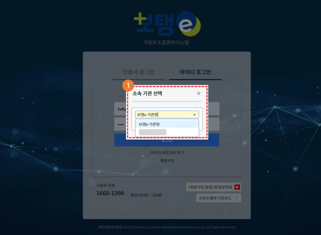 - 소속기관이 여러 개인 경우 로그인할 소속기관을 선택하여 접속 가능합니다.