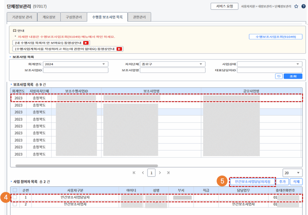 5. [민간보조사업담당자지정] 버튼을 클릭합니다.