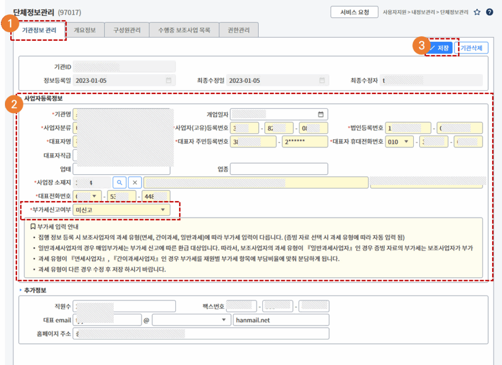 메뉴경로 : 사용자지원-내정보관리-단체정보관리 (97017)