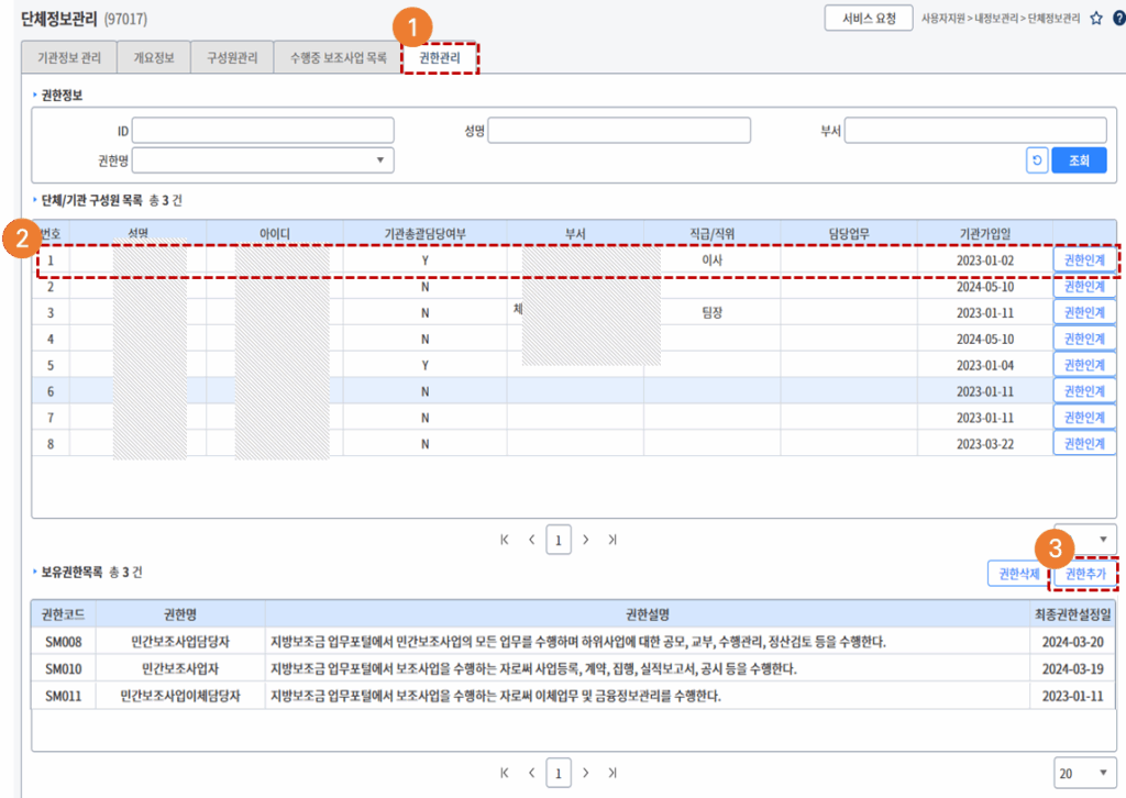 - 기관/단체 구성원목록 중 권한을 추가할 구성원을 선택합니다.
