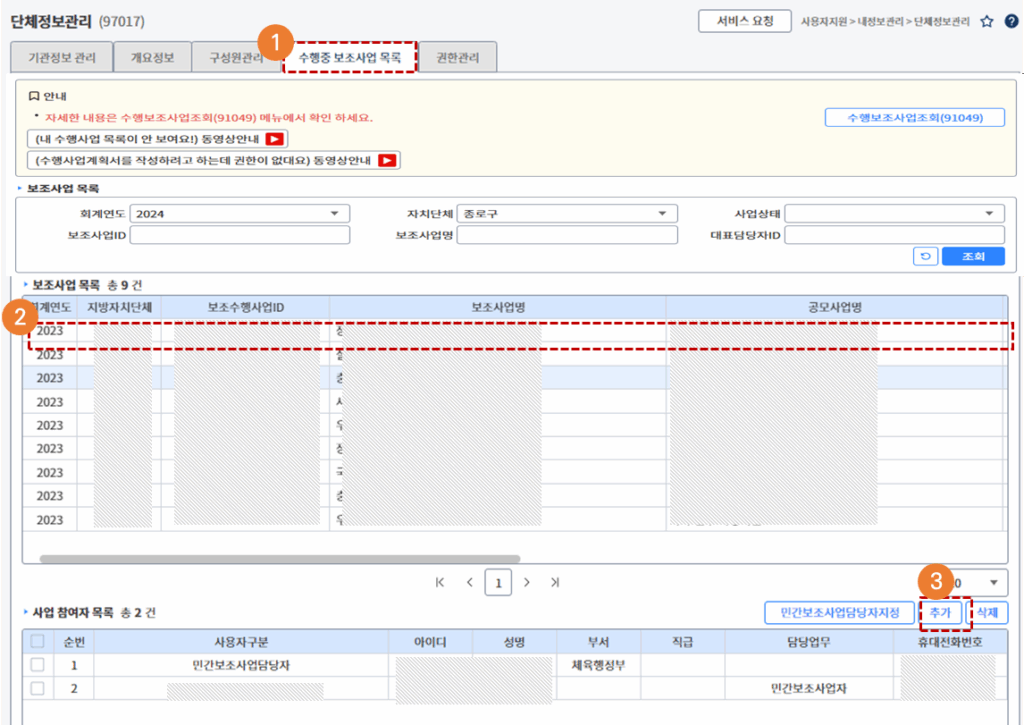 - [수행중 보조사업 목록] 탭을 클릭합니다.