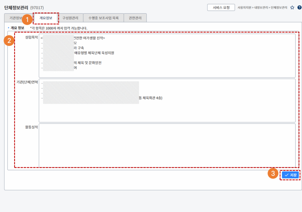 - 단체의 설립목적, 연혁, 활동실적 등을 입력합니다.