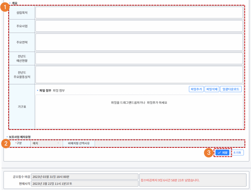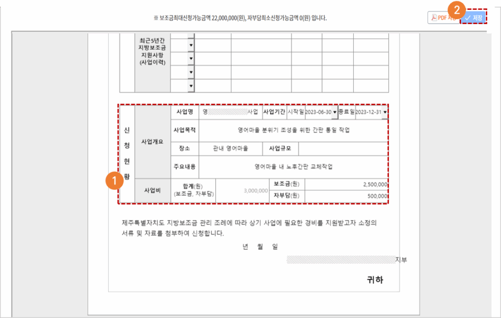 - 사업개요, 사업비 등 신청현황정보를 입력합니다.