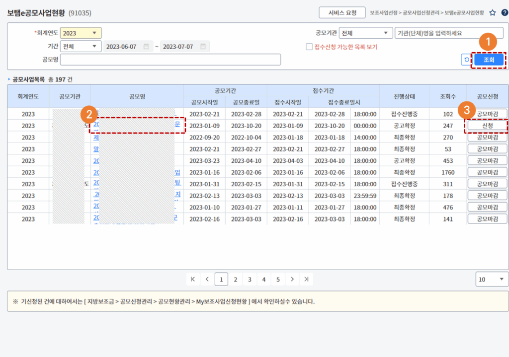 - [공모명]을 클릭하여 공모사업의 상세정보를 조회합니다.