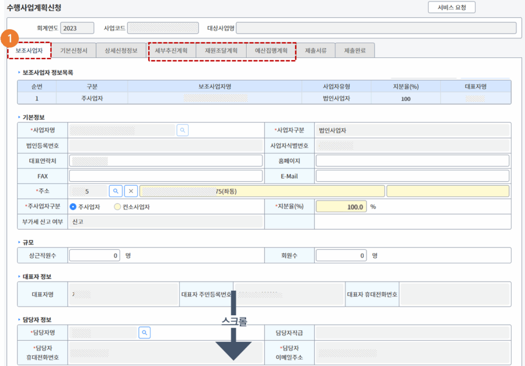 ** 공모신청 시 간소화정책 사용으로 미작성된 탭이 있으면 작성 후 제출합니다.(세부추진계획, 재원조달계획, 예산집행계획)