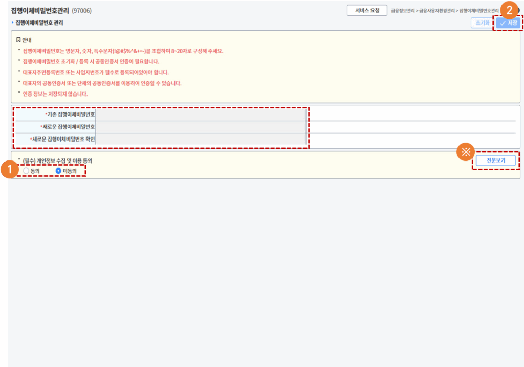 1. (필수)개인정보 수신 및 이용동의여부 : 동의 선택 후 집행이체비밀번호를 등록합니다.