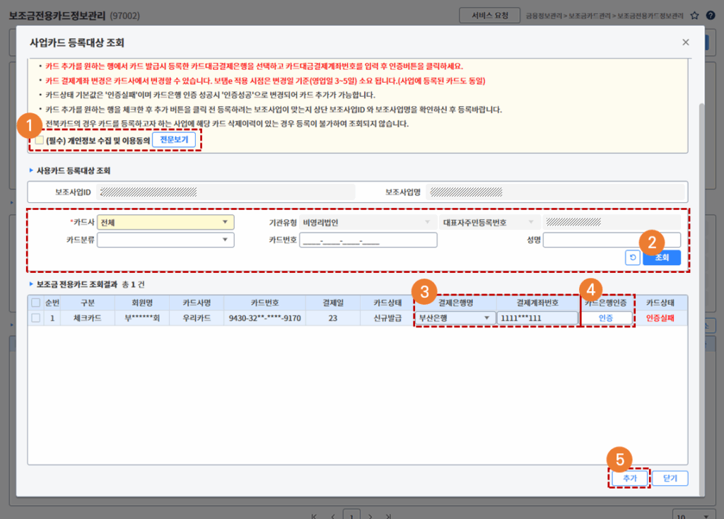 2. 금융정보관리-보조금카드관리-보조금전용카드정보관리(97002)
