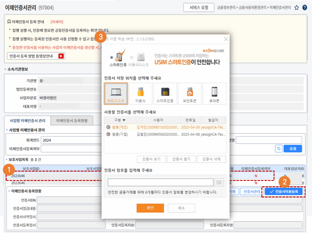 2. [인증서이용등록] 버튼을 클릭하여 이체작업에 사용할 인증서를 사업별로 등록합니다.