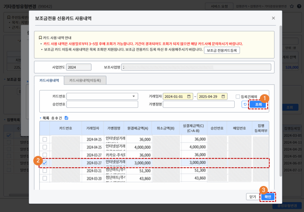 3. 집행관리-집행관리-기타증빙유형변경 (99042)-증빙유형 변경 (팝업)-보조금전용 신용카드 사용내역(팝업)