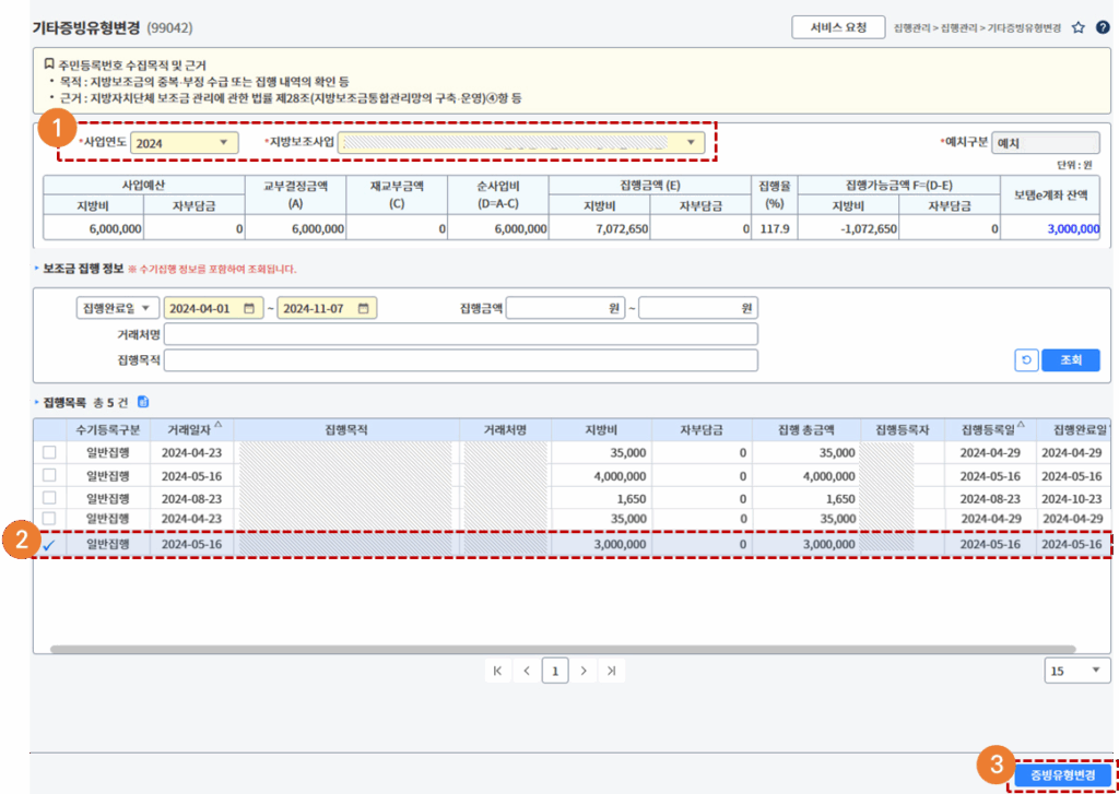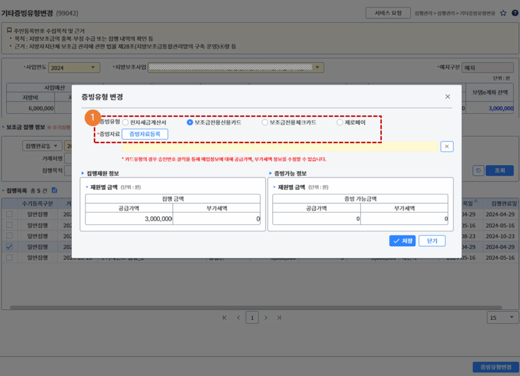보탬e 지방보조사업자 : 집행 과정 – 집행관리-기타증빙유형변경(예치형/비예치형 공통)