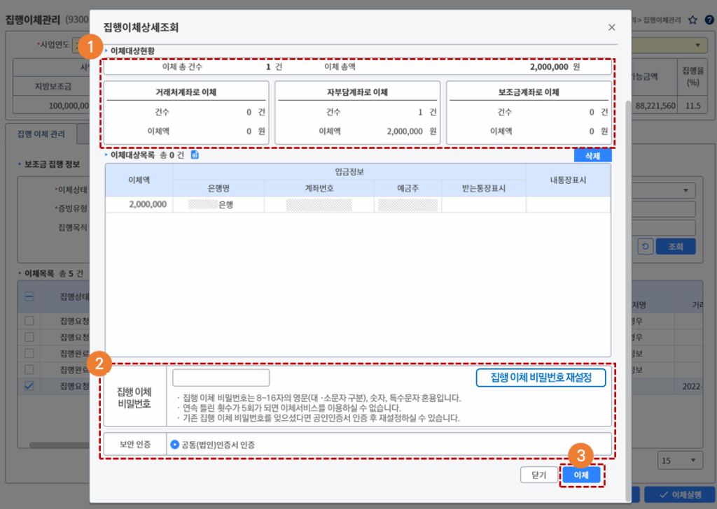 ** 이체실행 시 집행이체비밀번호 및  공동인증서 인증이 필요합니다.