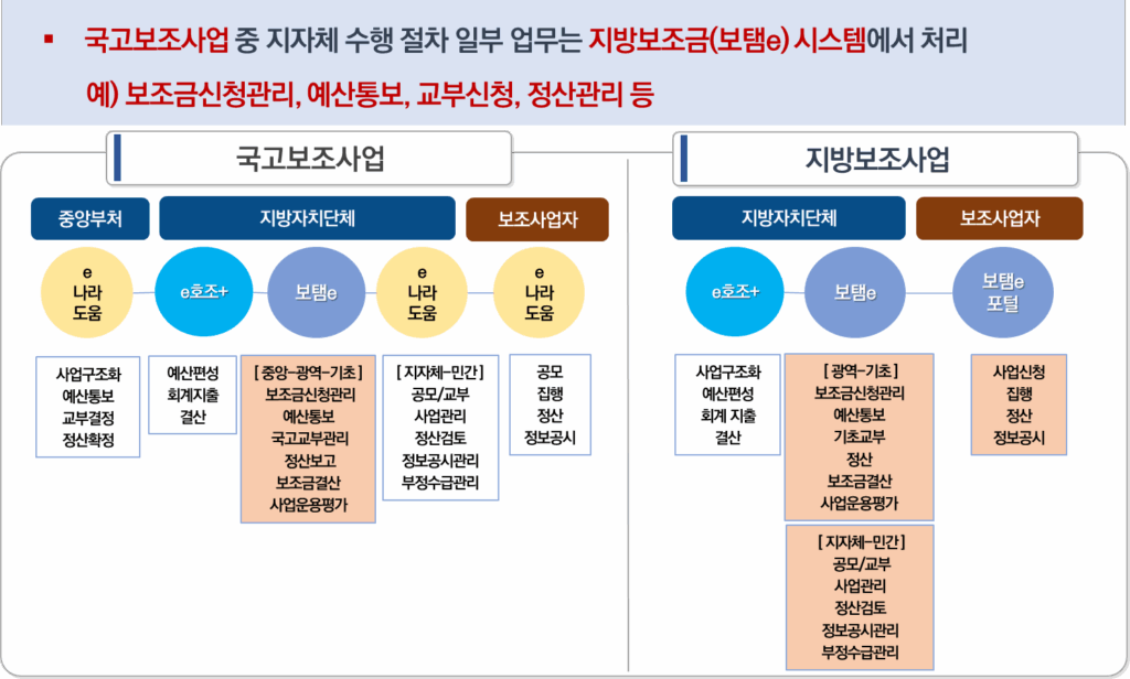 지방보조사업 담당자는 아래 오른쪽의 그림과 같이 e호조+와 보탬e를 사용해야 합니다.